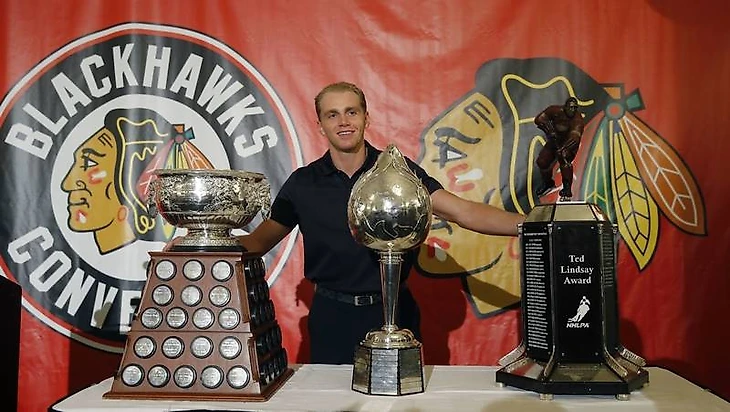 Американцы играют в НХЛ давно, ещё с самого первого сезона. За это время игроки USA взяли все важные награды*(даже по нескольку раз), но вот стать "лучшим бомбардиром сезона" никому не удавалось. В минувшем сезоне Патрик Кейн исправил эту прореху в наградном профайле американцев, став лучшим бомбардиром ("Арт Росс Трофи"). При этом форвард Чикаго с большой форой финишировал (17 очков "привёз" Джейми Бенну) и был единственным сдюжившим рубеж в 100 очков (106). Само собой он так же получил "Харт Трофи" и "Тед Линдсей Эворд"