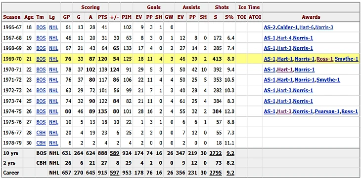 Следующем сезон Бобби закончит с 139(!!) очками и показателем полезности +124(!!!), получив еще один Харт Мемориал (как и годом позже). Еще 4 следующих сезона Бобби будет завершать регулярку имея каждый раз более 100(!!) очков (думаю был бы мастхэвом в фэнтази все эти годы и имел начальную стоимость эдак 2600).