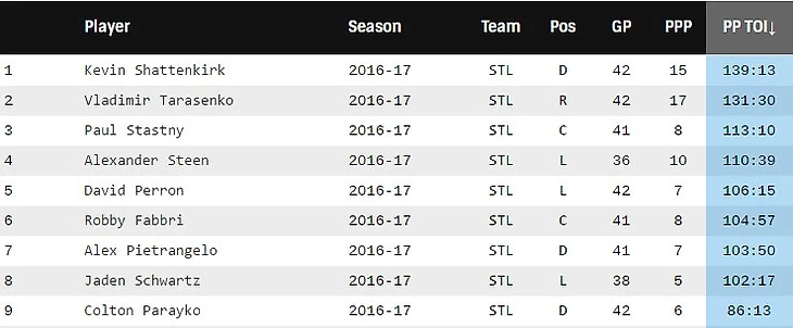 Сразу бросается в глаза то, что Джейдэн Шварц за 102 минуты, проведенные на площадке в большинстве набрал всего 5 очков. Да и Перрон, будучи вингером, играет в большинстве не намного сильнее. Наиль же сыграл в большинстве всего 4 минуты за весь сезон. Не использовать Якупова, с его голевым чутьем и контролем шайбы, в большинстве - как мне кажется, большая ошибка Кена Хичкока. Якупов может быть не очень полезен в равных составах, но большинство Сент-Луиса, играй в нём Наиль, могло бы стать более серьезным.