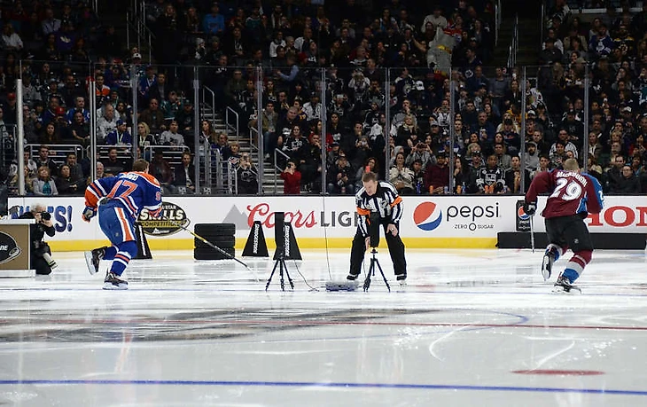 Самые быстроногие хоккеисты НХЛ соревновались по парам, после чего обладатель лучшего времени дня получал шанс пробежать полный круг в попытке побить рекорд всех времен, установленный год назад в Нэшвилле Диланом Ларкиным из "Ред Уингз".