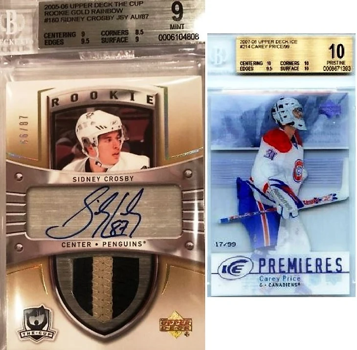 6) Далее идут две более старые карты. Сначала карта новичка Сидни Кросби из The Cup в состоянии на 9 баллов из 10 по цене 3300$. Не самую высокую цену можно объяснить тем, что это не основная версия, а золотая параллелка.