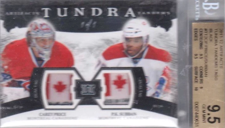 4) А есть на четвертом месте двойной тэг с канадскими флажками двух игроков самой канадской команды лиги. Artifacts 2011-12 подсерия TundraTandems – Кэри Прайс и П.К. Суббан. Тираж 1/1. Цена карты 1444$.