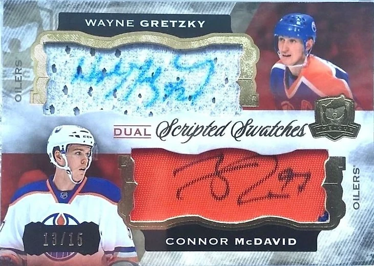 10) на десятом месте как раз Коннор МакДэвид (в компании Уэйна Грецки). За двойной автограф на кусках формы из подсерии Scripted Swatches было заплачено 2500$