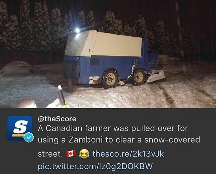 Фермера поймали при расчистке заснеженных улиц с помощью Замбони (угадайте страну с 1 раза):