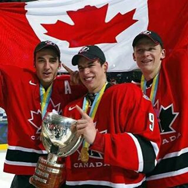 Патрис Бержерон, Сидни Кросби и Кори Перри после победы на МЧМ-2005.