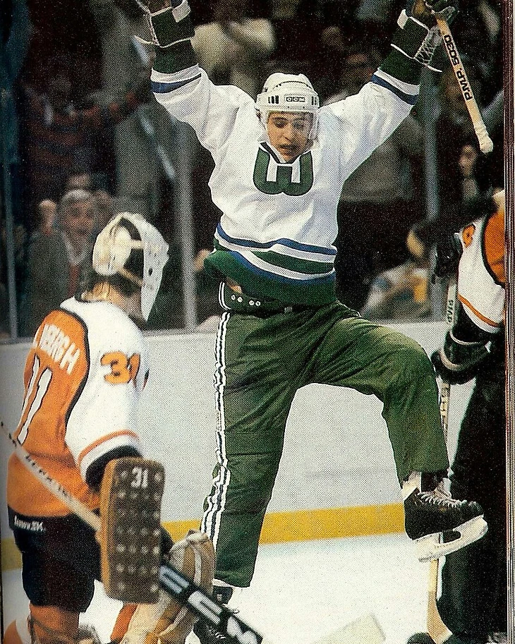 Рон Фрэнсис празднует шайбу в ворота Пелле Линдберга. Сезон 1983/84.