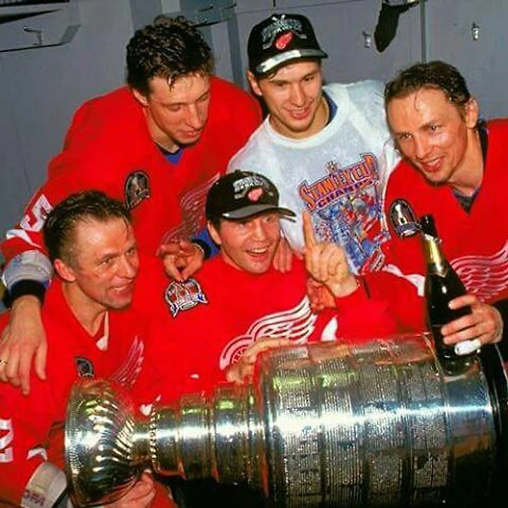 Владимир Константинов в окружении партнеров по «Детройту» с Кубком Стэнли. 1998 год.