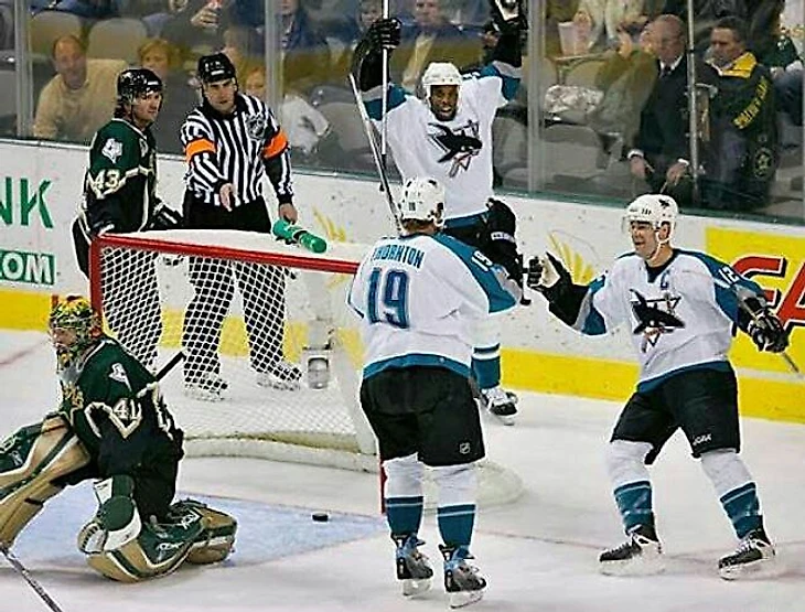Джо Торнтон празднует 200-ю шайбу, заброшенную в НХЛ в матче с «Далласом». 31 декабря 2006 года. Ассистентами стали Патрик Марло и Оуэн Нолан. Матч завершился победой «Сан-Хосе» со счетом 4:2.