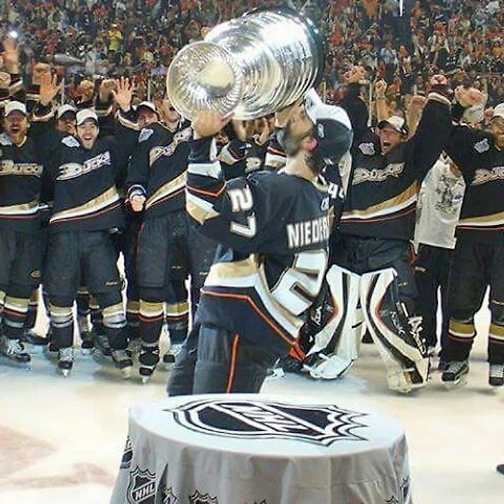 Скотт Нидермайер поднимает над головой первый и пока единственный Кубок Стэнли в истории «Анахайма». 2007 год.