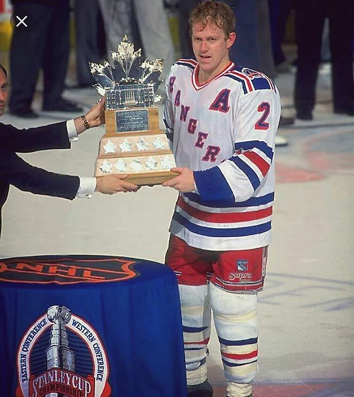 Брайан Лич принимает Конн Смайт Трофи из рук Гэри Бэттмана после победы «Рейнджерс» в финале Кубка Стэнли. 1994 год.