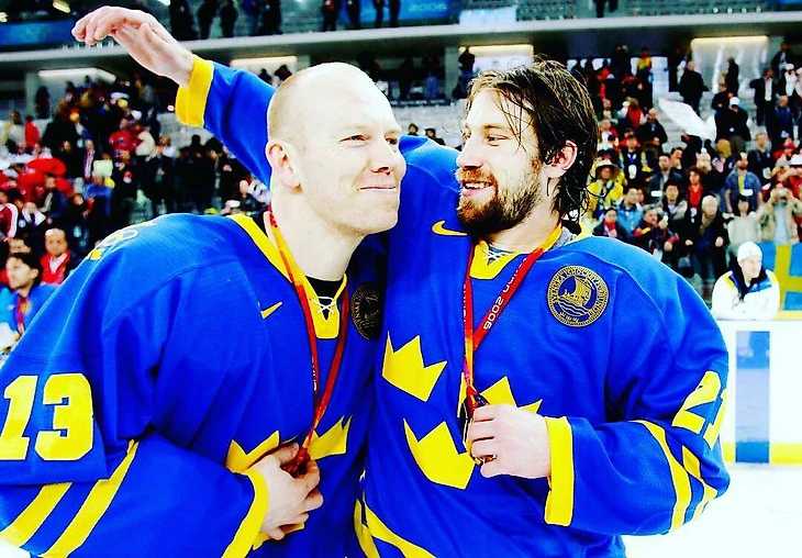 Мэтс Сундин и Петер Форсберг после победы сборной Швеции в финале Олимпийских игр-2006 в Турине.
