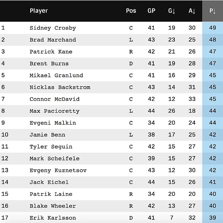 А точнее, 30 ноября. Он вернулся на лёд в матче с Оттавой и сразу же набрал 2 очка, сделав гол+пас. Вот чисто для интереса, если бы взять статистику лидеров Лиги по очкам, набранных с 30 ноября…