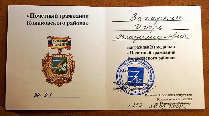 Игорь Захаркин родился в Брянске, но в юном возрасте переехал в город Конаково Тверской области. Там и начал в 10 лет играть в хоккей под началом тренера Михаила Денеша. Больше о тверской части жизни Захаркина неизвестно практически ничего, помимо того, что он заезжал в родные места после победы на чемпионате мира-2009, чтобы навестить маму. Так совпало, что тогда же глава города Валерий Максимов утвердил звание «Почетный гражданин Конаковского района», и вскоре им стал Захаркин, получивший удостоверение под номером 21. Этому факту есть подтверждение в текстах и фотографиях. А вот далее мы коснёмся одной из самых тёмных страниц биографии Захаркина, которую журналисты писали, по большей части, с его слов.