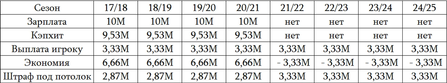 Некоторые контракты из-за суммы подписных бонусов даже в случае выкупа не несут никакой выгоды. Покажем это на примере знаменитого контракта Дэвида Кларксона – хоккеиста, который выдал единственный сезон с 30 шайбами, за что «Торонто» выписал ему 37 млн на 7 лет. Из этих 37 млн сразу 26 приходятся на бонусы, поэтому маленькая сумма экономии вычитается из гораздо большего кэпхита, включающего в себя большие бонусы.