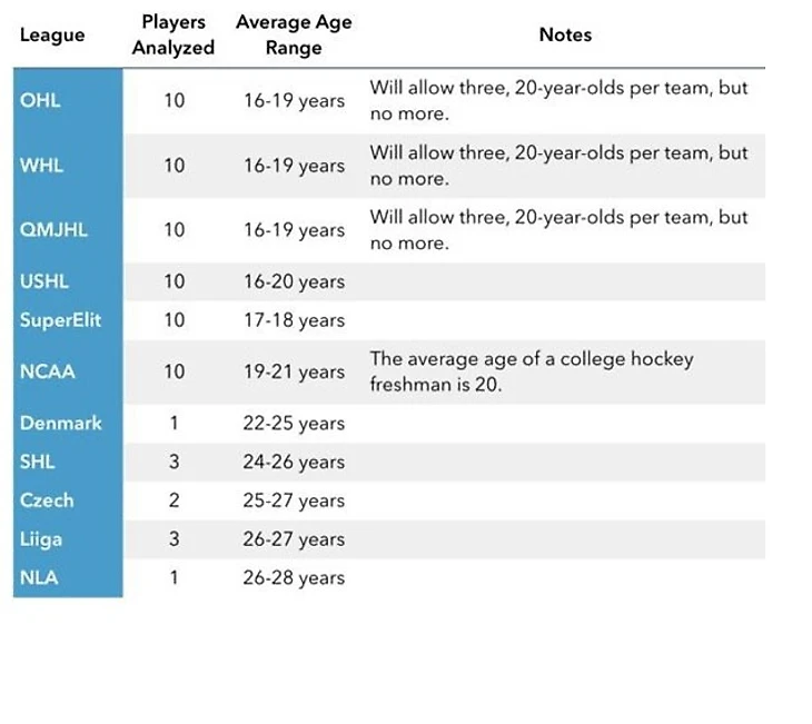 Как можно заметить, европейские защитники, развивающиеся в юниорской шведской лиге SuperElit, имеют наилучшие показатели в соотношении G/GP. Однако это всего лишь потому, что сюда были включены показатели G/GP Эрика Браннстрёма и Тимоти Лилжегрена. В текущем сезоне эти два защитника также играли и в SHL, однако их результаты G/GP в этой лиге являются одними из худших по сравнению со всеми остальными защитниками. Более того, европейские лиги, где средний возраст составляет 22-27, показывают меньшие G/GP, A/GP и P/GP среди всех категорий лиг.
