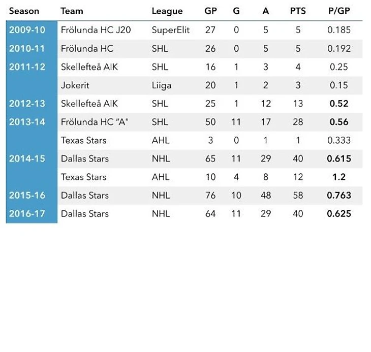 Так и продолжалось до его третьего сезона в SHL (Шведская Хоккейная Лига), когда он резко начал набирать большее количество очков. Как это можно объяснить? Низкая результативность Клингберга в 2010 году была причиной столь позднего выбора его на драфте, но могли ли тогда тренеры Далласа разглядеть его потенциал? Интересный факт о Далласе – в течение 10-летнего срока (с 2005 по 2015 года) техасцы задрафтовали наибольшее количество защитников из Европы, которые в итоге сыграли не менее 30 игр в НХЛ. И, несмотря на то, что это всего лишь 5 человек – это больше, чем у любой другой команды: