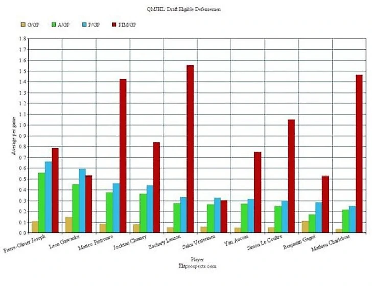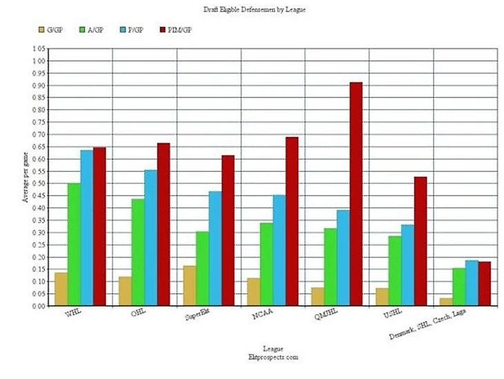 При рассмотрении данных полезно использовать диаграммы, которые могут помочь в определении потенциала игрока в части атакующих действий. Согласно показателям, результативность молодых защитников европейских лиг ниже результативности их соотечественников из североамериканских лиг. И хотя с увеличением среднего возраста игроков в лигах результативность падает (независимо от страны), защитники, развивающиеся в NCAA, все равно играют в атаке лучше, чем защитники лиг QMJHL и USHL.