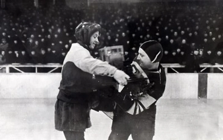 На снимке: капитан челябинского «Авангарда» Николай Захаров вручает капитану сборной ГДР модель трактора С-80, выпущенного на Кировском заводе (сезон-1953/1954).
