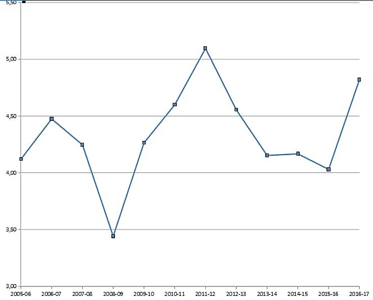 Помимо этого, Овечкин стал куда реже бросать. Уже ставший хрестоматийным эпизод случился в матче с «Филадельфией», когда Александр из вполне бросковой для себя прежнего позиции отдал пас на Нисканена. Эта диаграмма показывает, сколько минут уходит у Овечкина на бросок в каждом сезоне: