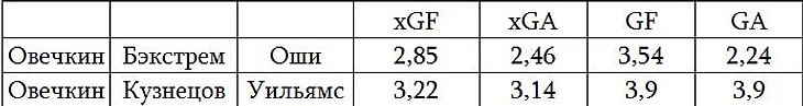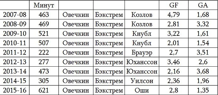 Собственно, прекрасно видно, что тройки с Овечкиным в составе создают максимальное количество голов, начиная еще с сезона-2007/08, вариант с Кузнецовым в качестве центра мог бы быть даже лучшим в атаке, но здесь толком некому отрабатывать в обороне.