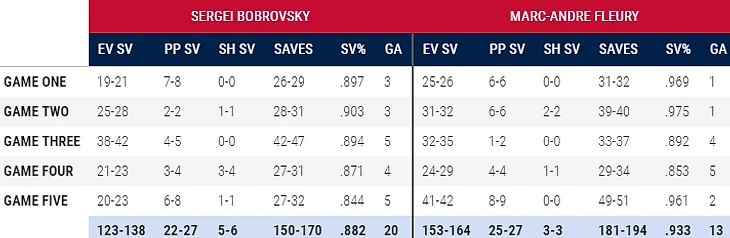 Вратарскую дуэль Флери у Бобровского выиграл вчистую, даже при том, что бросками его нагружали больше. Особенно заметна разница была в домашних матчах «пингвинов». В заключительной игре серии Флери сделал 49 сэйвов, установив личный рекорд в плей-офф (если без учета овертаймов).