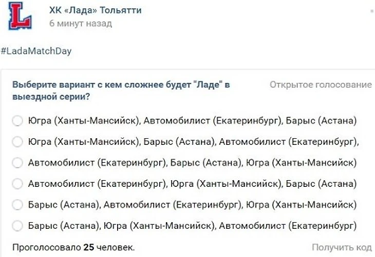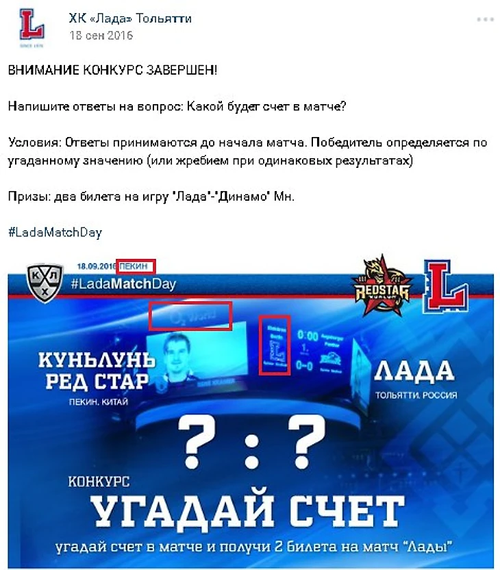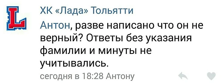 - По условиям конкурса в группе, необходимо было назвать минуту и автора первой шайбы "Лады". После того, как "Лада" по итогам матча записала себе баранку в графе заброшенные шайбы, человек, написавший "никто", получил вот такой вот ответ.