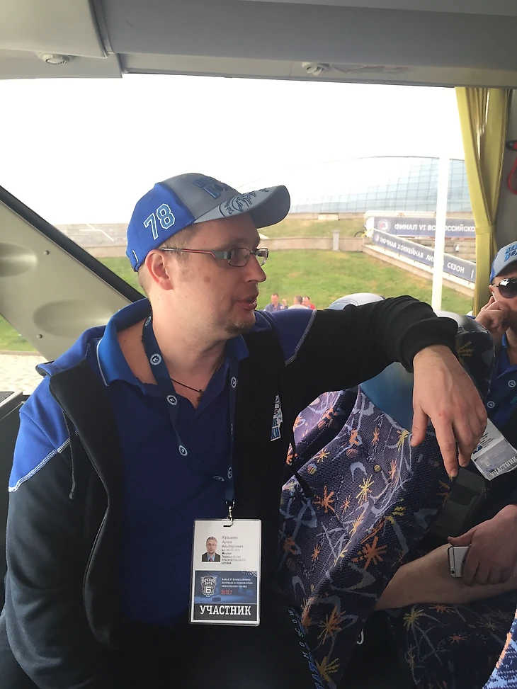 Сбор по расписанию. Атмосфера напряженная, ожидание автобуса. Поднять команде настроение мастерским владением клюшки пытается наш знаменитый пивовар Алексей Жарков №30: