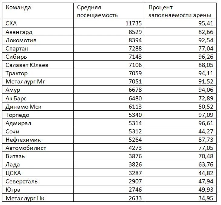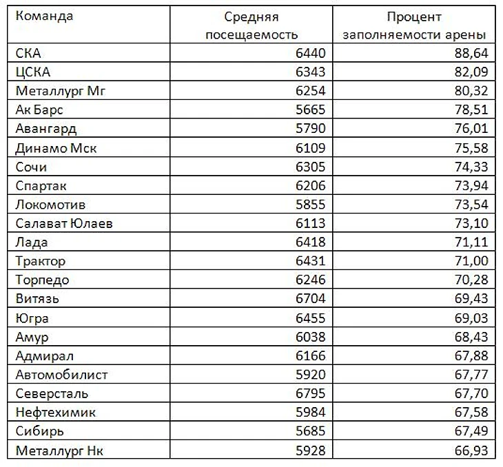 Теперь посмотрим на зрительский интерес. Для примера возьмём сезон 2016-2017. В таблице будет средняя посещаемость домашних матчей и процент заполняемости арены.