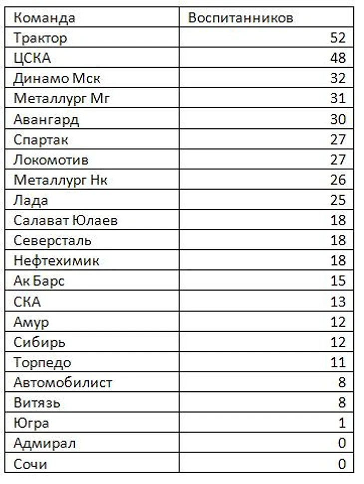 Школа Трактора традиционно лидирует в рейтинге «поставщиков талантов». Челябинск давно уже считается хоккейным центром страны. Всего в сезоне 16/17 выступало 64 воспитанника этого уральского города. Нет в Лиге воспитанников Адмирала и Сочи, что неудивительно – это новые клубы. Худшие по работе с молодёжью – Витязь, Автомобилист, Торпедо, Сибирь и Амур. Немногим лучше дела у СКА. У Подольска всё та же проблема – малое население города. А в Екатеринбурге есть школы помимо Автомобилиста, и в сумме они дали Лиге 18 игроков, выступавших в сезоне 16/17.