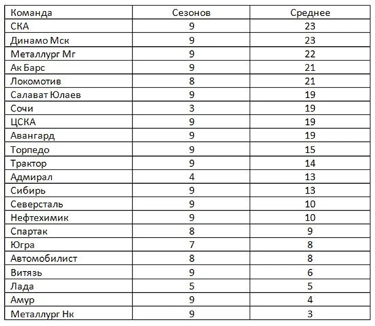 Сначала посмотрим на достижения клубов за время их участия в Лиге. Плей-офф трогать не будем, а возьмём за основу итоговые таблицы регулярного сезона. Смотрим все девять сезонов, за последнее место в таблице команда получает 1 балл, за предпоследнее – 2 балла, и так далее. Победитель получает количество очков, равное числу участников. Всё просто. Затем вычислим средний показатель каждого клуба.
