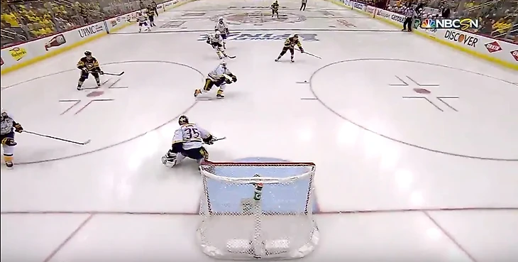 Третий гол: Малкин убежал вместе с Кесселом в быстрый отрыв и против них был Роман Йосси. Ринне снова не выручил, но и бросок Малкину удался на славу.