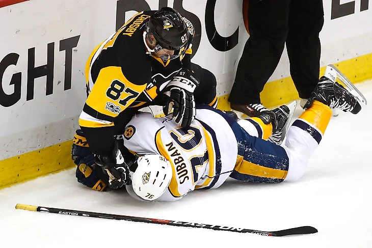 Итак, Суббан, подхватив шайбу в средней зоне, врывается с ней в зону Питтсбурга, Кросби догоняет его и делает несколько тычков своей клюшкой в спину Пи Кея. Следующая их встреча произошла спустя две-три секунды за воротами Мюррея. Суббан уходит от силового приема Кросби, шайбу подбирает кто-то из игроков Нэшвилла, и далее происходит эпизод, после которого очень многие журналисты вспомнят про смешанные единоборства, но ничего не скажут о несправедливости решения арбитра. Кросби двумя руками хватает Суббана за шею и кидает того на лед. Разумеется, сверху оказался именно Сид, и совершенно случайно сделал несколько десятков характерных движений правой рукой, вжимая голову оппонента в лед. С кем не бывает, не правда ли?! Суббану удалось вырваться из этого давления и подняться на ноги. Прозвучал свисток арбитра.