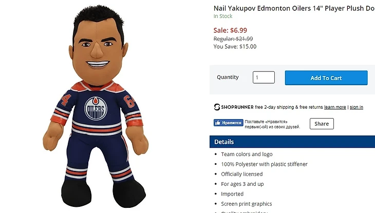 А в интернет-магазине НХЛ до сих пор можно приобрести вот такого игрушечного Наиля Якупова в форме Эдмонтона. Правда, уже со скидкой в 30%...