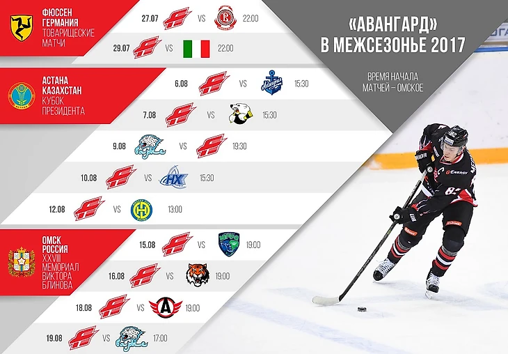 Ну а 20 июля "Авангард" отправился на сборы в Германию. Там команда проведет два товарищеских матча, а затем последуют турниры в Астане и Омске. Кстати, билеты на Мемориал Блинова уже в онлайн-продаже.