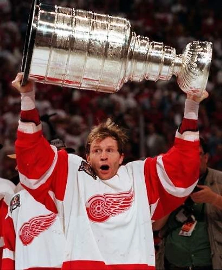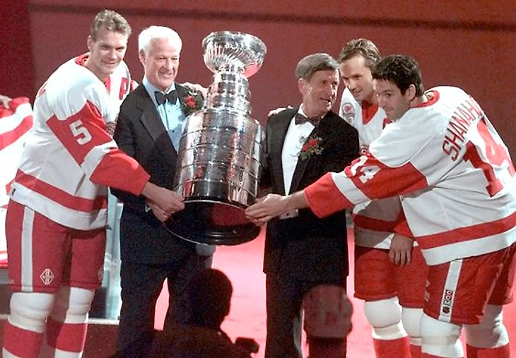 Никлас Лидстрем, Горди Хоу, Тед Линдсей, Стив Айзерман и Брендан Шэнахан с Кубком Стэнли. 1997 год.
