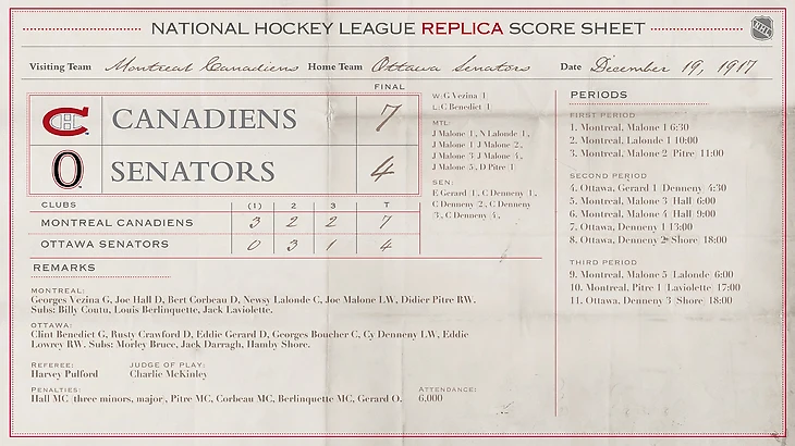 К 100-летию НХЛ сделала любителям хоккейной истории подарок – выложила на официальный сайт все протоколы матчей, начиная с самого первого сезона. Вот составы «Монреаля» и «Оттавы» с самого первого в истории лиги матча.
