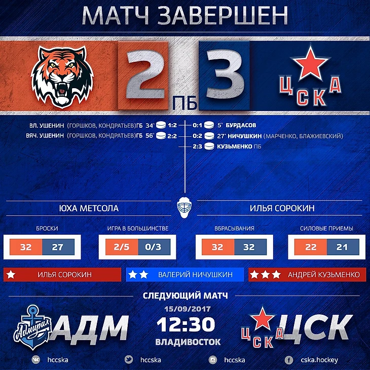«Амур» (Хабаровск) – ЦСКА (Москва) – 2:3 (0:1, 1:1, 1:0, 0:0, 0:1)