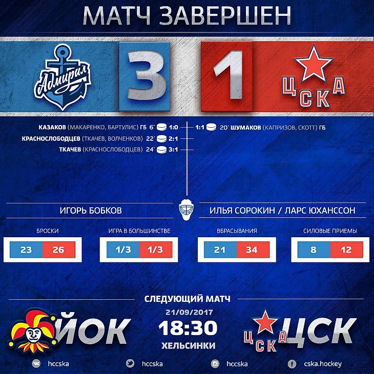 «Адмирал» (Владивосток) – ЦСКА (Москва) – 3:1 (1:1, 2:0, 0:0,)