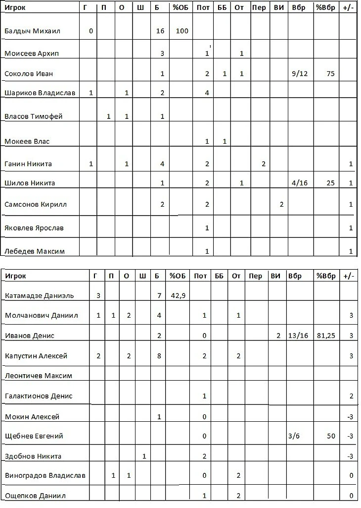 Г-гол, П-пас, О-очки, Ш-штраф, Б-броски, %ОБ-%отраженных бросков, Пот-невынужденные потери, ББ-блокированные броски, От-активные отборы, Пер-перехваты, ВИ-вне игры, Вбр-вбрасывания, %Вбр- % выигранных вбрасываний, +/--коэффициент полезности