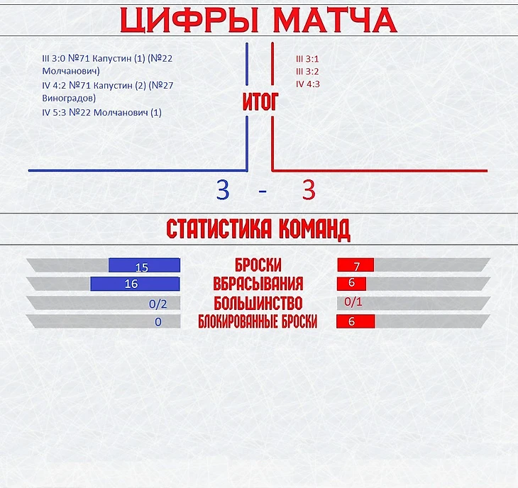 Четвёртый отрезок матча начался с размашистой контратаки хозяев, которую разогнал Влад Виноградов, после успешного отбора шайбы в углу своей зоны он бросил в прорыв Капустина, Алексей легко убежал от защитников и неотразимо бросил – 4:2! И тут соперника словно подменили – игроки в красных майках перешли в позиционное нападение, надолго запирая оба наших звена в своей зоне. Катамадзе крутился в воротах, как белка в колесе, но третья шайба всё-таки влетела в наши ворота: после очередного броска и кучи-малы на нашем пятаке, кто-то смог протолкнуть её мимо вратаря. 4:3. Синяя сторона трибун полезла за валидолом, у некоторых родителей тряслись руки, ноги и даже головы. Хотя не факт, что только из-за игры…. Но продолжим обзор. Пару моментов загубили Капустин и Иванов. А затем вновь игра была переведена на нашу половину поля. И тут Главный тренер «Кировчанина» взял тайм-аут. До конца периода оставалось ещё 5 с небольшим минут. Это успокоило парней, начавших было поднимать панику, а вскоре один из главных героев второй половины, Молчанович, закончил свой сольный проход неотразимым броском под перекладину – 5:3! В самой концовке Иванов мог увеличить отрыв синих, но вновь не сумел переиграть вратаря соперника. Зато он блестяще переигрывал всех на точке, во втором периоде не отдав ни одного единоборства на вбрасываниях. Финальная сирена ознаменовала первую победу в сезоне нашего любимого клуба! Так держать, парни!