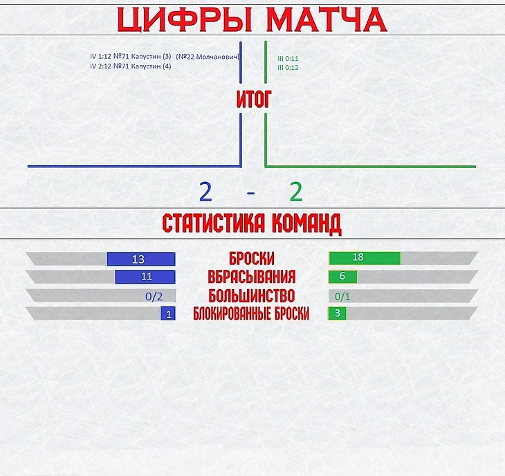 Про вторую половину встречи рассказывать гораздо интереснее. Ребята не смотрели на счёт, работали, как могли. Правда, пропустили первыми. Редкий провал в обороне закончился выходом 1 в 1, и 61-й номер синих впервые в этом сезоне капитулировал. 94 минуты и 54 секунды или 6 периодов с небольшим длилась его сухая серия в официальных играх. За первой прилетела и вторая – при выходе 2 в 1 Михаил слишком активно ждал прострельной передачи на дальнюю штангу, а нападающий соперника неожиданно бросил в ближний верхний угол. Но «Кировчанин» не опустил руки, парни шли вперёд, создавали моменты и в фирменном стиле их транжирили.
