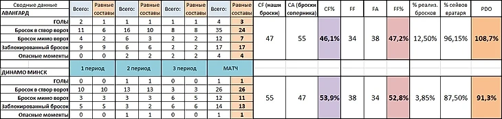 Но коэффициенты Корси (46,1%) и Фенвик (47,2%) показывают, что в равных составах на площадке гости имели небольшое преимущество. Хорошая реализация и уверенная игра Доменика Фурха, позволили одержать в этом матче уверенную победу. Бросается в глаза пассивность игроков Динамо Минск в третьем периоде, всего 3 броска в створ, 5 бросков мимо ворот и 2 броска блокированных Авангардом. По статистике Авангарда в 8 бросков в створ и 7 бросках мимо нельзя говорить о доминировании или закрытой игре в третьем периоде со стороны Авангарда.