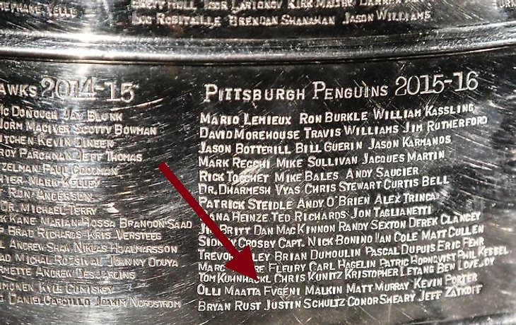 Имя форварда «Питтсбурга» Евгения Малкина нанесено на Кубок Стэнли с ошибкой. На фотографиии заметно, что его имя написано не через «E», а через «F». В прошлом году вроде как совершили такую же ошибку, но потом сфоткали с другого ракурса, и ошибки уже не было. Возможно, на этот раз то же самое, и фамилия написана правильно.