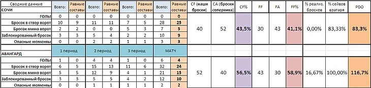 Как мы видим из сухой статистики Авангард нанес всего на 10 бросков в створ больше, провел на 6 силовых приема меньше и проиграл по вбрасываниям. На первый план вышла реализация моментов и игра в большинстве.