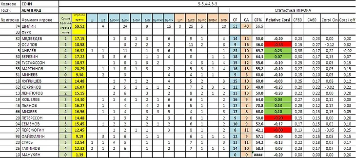 Коэффициенты Корси (56,5%) и Фенвик (58,9%) показывают нам, что Авангард доминировал на площадке в равных составах. Реализация составила 16,67%, это выше чем наша команда показывала в матчах, которые мы уверенно выигрывали ранее, там показатель был 12,5% (Локомотив, Динамо Минск).