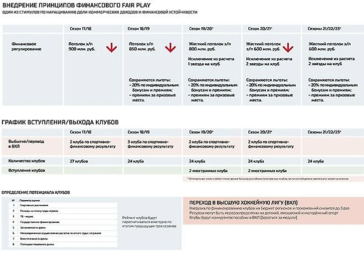 Вот такой план развития лиги, по мнению руководства КХЛ, нам выдвинули в конце прошлого сезона. Ну, о нем чуть попозже, пока поговорим о нынешней ситуации. Некоторые говорят, мол, в лиге вообще не существует потолка зарплат, тут они неправы. Он существует, но назвать его жестким никак нельзя, он скорее натяжной. Все клубы лиги могут его обходить, платя при этом соответственную сумму за превышение. Возникает вопрос : "Ну как мы можем называть себя сильной и конкурирующей лигой, когда многие клубы лиги чихают на этот самый потолок?" Более того, у нас итак в лиге есть разделение клубов на : богатых и всех остальных, это убивает почти всю интригу, так еще и руководство лиги, делает все, чтобы наш чемпионат превратился в соперничество 7-8 клубов. Если бы у нас был жесткий потолок зарплат, то клубам-олигархам приходилось бы немного снизить свои аппетиты и начинать более обдуманно походить к подписанию тех или иных хоккеистов, да и хоккеисты бы, большое их число, стали бы получать деньги, на которые они реально играют. И не стоит забывать, что зарплатные ведомости у нас в лиге держат под стражайшим секретом, в отличие от НХЛ, к которой мы стремимся, уже давным-давно можно найти информацию про заработную плату тех или иных хоккеистов. Как только хоккеисты подписывают контракт с клубами НХЛ, сразу же появляется информация какую сумму получат игроки за годы проведенные в клубе. Вы можете представить, что завтра любой клуб КХЛ озвучит заработную плату любого хоккеиста своей команды? Я нет. Для чего закрывают ведомость? Чтобы народ не узнал какие деньги получают некоторые хоккеисты, которые просто-напросто не играют на те деньги, которые им падают на карточку. Пример - Данил Мамаев из Трактора. Защитник дебютировал в лиге в прошлом сезоне и не сказать, чтоб удачно, но получает он на уровне среднего игрока КХЛ, а все потому что у него тесть - Иван Сеничев, директор челябинского клуба. И вы представляете какая волна поднялась бы если бы его цифры в контракте появились в открытом доступе? Сразу же бы начали спрашивать с руководства, почему они платят довольно не малые деньги достаточно посредственному игроку, когда за эти же средства можно купить игрока лучше него? Ну и судя по схеме выше, с сезона 18-19 в лиге будет жесткий потолок зарплат, но все-таки, так называемую звезду, из-под этого потолка вывести можно, а вот с сезона 20-21 у нас в лиге должно настать равенство. Потолок будет 600 миллионов рублей. Это означает, что уровень хоккея должен упасть, но лига станет конкурентной. 600 миллионов, прямо скажем, небольшая сумма, и скорее всего мы доживем до того момента, когда игроки из КХЛ будут убегать в НХЛ за большими контрактами, а не наоборот, как сейчас. Зато игроки будут вынуждены снизить свои завышенные требования, ведь 600 миллионов это не 900, да и клубов на тот момент должно стать меньше, не стоит про это забывать.