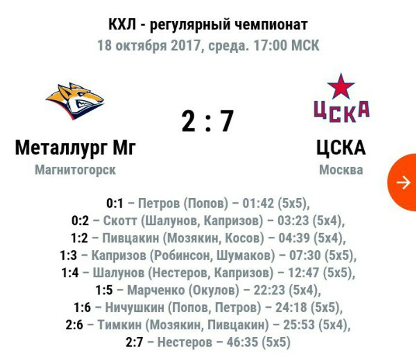 07:30 1:3 97.Капризов (37.Робинсон, 70.Шумаков). ЦСКА