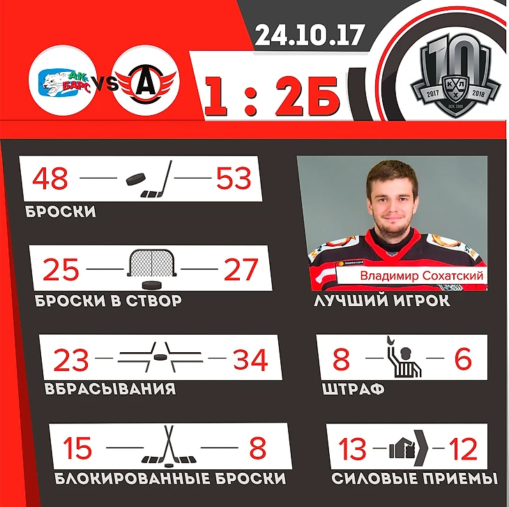 Статистика говорит о том, что "Авто" перебросал своего соперника, что логично. Другой вопрос, что не все они долетали до цели. Блокированных бросков как раз больше у хозяев. Безусловно, необходимо поблагодарить Владимира Ткачева, который 3 раз умудрился создать для себя момент, не попав в ворота. Да и тот же Лукоянов, забросивший единственную шайбу, не смог реализовать 2 убойных момента. Однако, нельзя преуменьшать роль Сохатского и компании. Быстрые смены, аггресивный стиль, игра в "тело". Все это помогало сдерживать мощную атаку хозяев. Единственный минус - это ненужные удаления. Получив возможность поиграть в большинстве, сначала Трямкин,а затем Чайковский, оставили "Автомобилист" в меньшинстве, "схватив" глупейшие удаления. Но спасибо бригаде меньшинства и опять же Сохатскому.