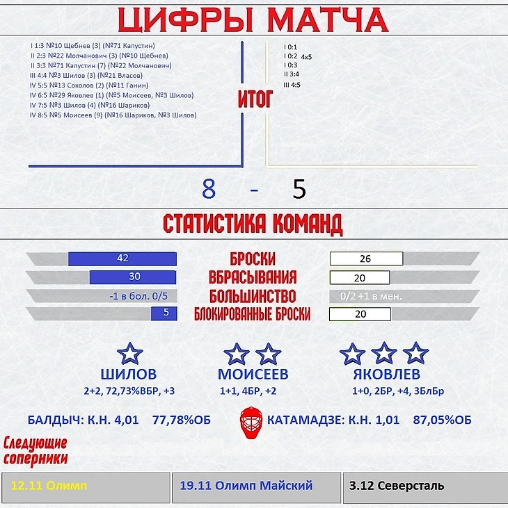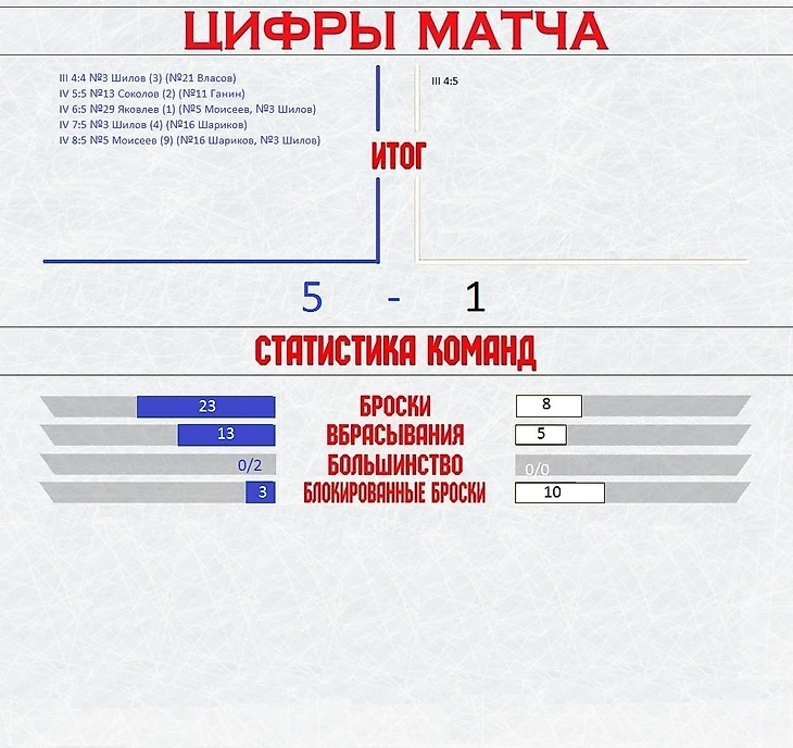 После этого Влад Шариков помог сделать дубль Шилову, а в концовке уже сам Никита бросил в прорыв Влада, тот атаковал с острого угла, вратарь выронил шайбу, а на добивании первым оказался Моисеев. 8:5, есть четвёртая победа! С сединою на висках…