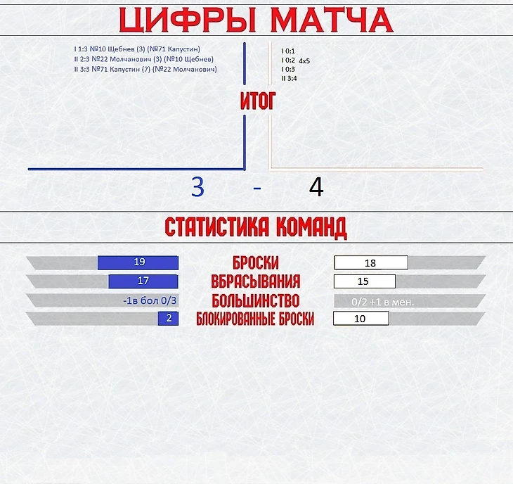 В концовке первого периода Щебнев одну шайбу отыграл – Капустин из-за ворот парашютом запустил передачу на пятак, где караулили сразу двое наших игроков. И если Молчанович с лёту не смог попасть по каучуковому диску, то Жене шайба попала прямо на крюк, и он переправил её в противоход не успевшему толком переместиться вратарю. Во втором периоде картина не поменялась – соперник так же легко проходил нашу защиту, синие так же натужно атаковали. Смогли, было, сравнять счёт, но и любимую ничью удержать не удалось. 3:4, и тяжёлые предчувствия перед второй половиной. Парни, ну нельзя так играть. Нельзя! Видите, что не идёт в обороне – не выдёргивайтесь вперёд. Женя Щебнев – молодец, забил. Но ты центральный нападающий, ты первым должен нестись назад. А у нас шайба вышла из зоны белых, и три игрока атаки трусцой покатили назад. Кириллу Самсонову, Максиму Леонтичеву и некоторым другим товарищам пора бы выучить элементарные правила входа в зону. И защитники, если вы играете в большинстве, и вратарь стучит клюшкой – значит время удалённого подходит к концу, и пора одному из вас откатиться назад, дабы не прозевать очередную контратаку. Так нам чуть не забили пятый…